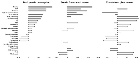 Spearman correlations between food groups and protein intake in 5879 multi-ethnic U.S. adults. Correlations were adjusted for age, sex, race/ethnicity, and energy intake. Only significant associations (p-value < 0.05) are shown. The bars represent correlation coefficients (ρ, rho).