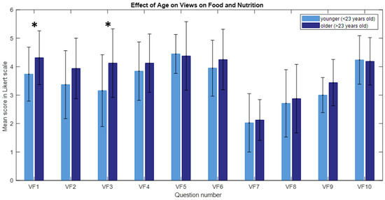 The effect of age on views on food and nutrition (VF). The bars represent the mean scores, while the error bars indicate the standard deviations (* p < 0.05).