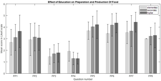The effect of education on preparation and production of food (FP). The bars represent the mean scores, while the error bars indicate the standard deviations.