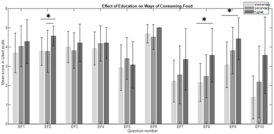 The effect of education on ways of consuming food (EF). The bars represent the mean scores, while the error bars indicate the standard deviations (* p < 0.05).