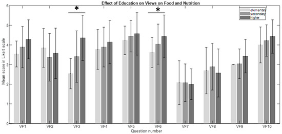 The effect of education on views on food and nutrition (VF). The bars represent the mean scores, while the error bars indicate the standard deviations (* p < 0.05).
