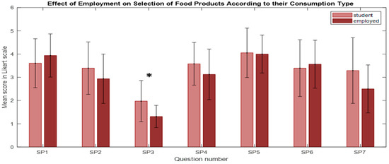 The effect of employment on the selection of food products according to their consumption type (SP). The bars represent the mean scores, while the error bars indicate the standard deviations (* p < 0.05).