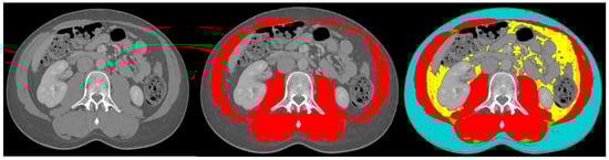 Example body composition analysis. The left image displays a cross-sectional view at the lumbar level L3, the middle image indicates muscle mass tagged in red, and the right image shows subcutaneous adipose tissue tagged in blue and visceral adipose tissue tagged in yellow.