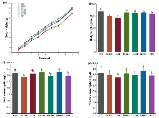 Effects of soluble and insoluble dietary fibre ratio on the body weight of obese mice. (a) Body weight. (b) Body weight gain after an eight-week dietary fibre intervention. (c) Food consumption. (d) Water consumption. Data are presented as means ± SD (n = 10). Differences between each group corresponding to different letters are statistically significant (p < 0.05).