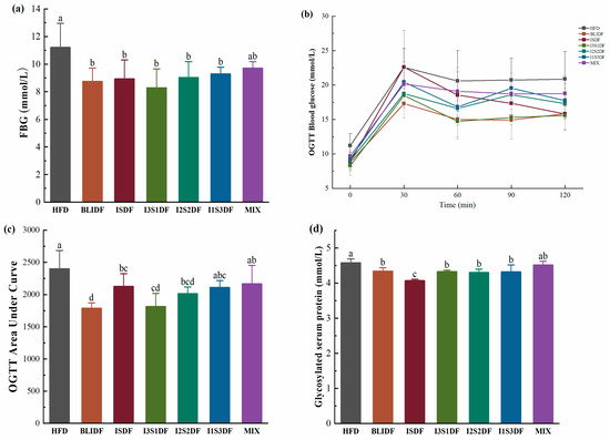 Effects of soluble and insoluble dietary fibre ratio on the glucose homeostasis of obese mice. (a) Fasting blood glucose. (b,c) OGTT (b) and AUC of OGTT (c) in mice with different dietary fibre interventions. (d) Glycosylated serum protein levels in serum. Data are presented as means ± SD (n = 10). Differences between each group corresponding to different letters are statistically significant (p < 0.05).