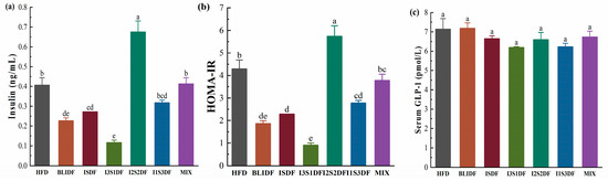 Insulin promotes the uptake and utilization of glucose by body cells and inhibits glycogen breakdown, thus reducing blood glucose levels. The serum insulin levels of the mice in each group were determined, and HOMA-IR was calculated. As shown in Figure 4a, the insulin level of the obese mice significantly decreased in the BLIDF, ISDF and I3S1DF groups, but significantly increased in the I2S2DF group compared to the HFD group. Moreover, the BLIDF, ISDF, I3S1DF and I1S3DF groups showed a significant decrease in insulin resistance compared to the HFD group (Figure 4b). Insulin resistance, considered a potential pathological mechanism of many metabolic syndromes and cardiovascular diseases (including obesity), can decrease insulin efficiency. GLP-1 is an incretin secreted by intestinal endocrine L cells, stimulating insulin secretion to reduce blood glucose levels and promoting the proliferation and differentiation of β cells [20]. As illustrated in Figure 4c, no statistically significant difference in GLP-1 levels was observed among the various groups, indicating that dietary fibre interventions did not significantly impact the regulation of this incretin hormone.