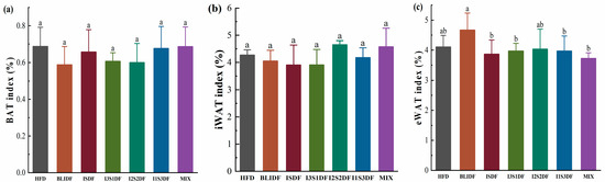 Effects of soluble/insoluble dietary fibre ratio on organ index in mice. (a) BAT index. (b) iWAT index. (c) eWAT index. Data are presented as means ± SD (n = 8). Differences between each group corresponding to different letters are statistically significant (p < 0.05).