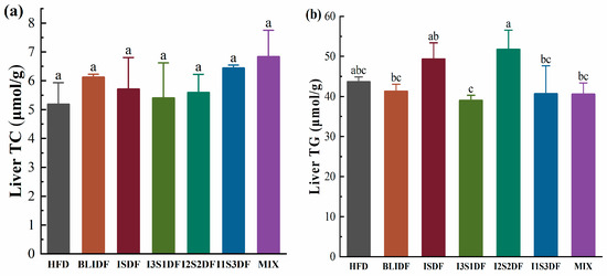 Effects of soluble/insoluble dietary fibre ratio on liver lipid metabolism in mice. (a) TC. (b) TG. Data are presented as means ± SD (n = 6). Differences between each group corresponding to different letters are statistically significant (p < 0.05).