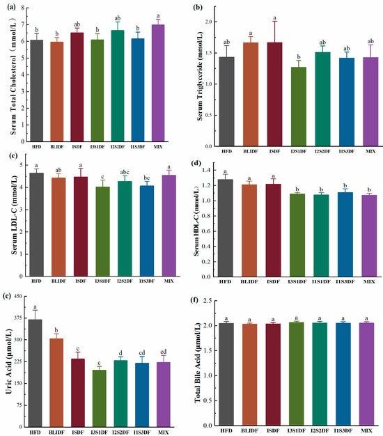 Regarding the serum lipid profile analysis, the results showed that, as illustrated in Figure 7a, the MIX group had a higher TC level compared to the HFD group, while the I3S1DF and I1S3DF groups exhibited a significant reduction in serum LDL-C levels compared to the HFD group (Figure 7c). Moreover, the I3S1DF, I2S2DF, I1S3DF and MIX groups showed a significant decrease in serum HDL-C levels compared to the HFD group. In contrast, the BLIDF or ISDF intervention alone did not significantly affect the serum HDL-C levels in the mice. Compared to the HFD group, none of the dietary fibre interventions altered the serum TG (Figure 7b). Elevated concentrations of TC are correlated with the advancement of coronary heart disease and the development of atherosclerosis. LDL-C can transport cholesterol into peripheral tissues, and elevated cholesterol levels can contribute to atherosclerosis [21]. It can be seen that I3S1DF and I1S3DF can alleviate the abnormal serum lipid metabolism. Further, all the fibre interventions reduced UA levels (Figure 7e), and no significant difference in TBA content between the groups was observed (Figure 7f). UA may contribute to the onset of conditions such as hyperuricemia, gout and nephritis [22]. Our results showed that dietary fibres have the capacity to lower UA levels, which may reduce the incidence of this series of diseases.