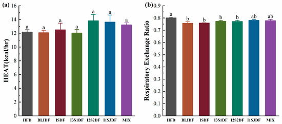 Obesity arises due to an imbalance between energy intake and expenditure, specifically characterized by excessive energy intake relative to insufficient energy expenditure. So, we examined the energy expenditure and RER of the obese mice in each group. Our results indicated no statistically significant difference in energy expenditure among the groups (Figure 8a), while the RER values in all the groups were less than 1, and the RER values were significantly reduced in the BLIDF, ISDF, I3S1DF and I2S2DF groups compared to the HFD group (Figure 8b). An RER of 1 indicates aerobic respiration using glucose as the sole substrate, while an RER of less than 1 indicates aerobic respiration using fat as the substrate [23]. The results suggest that the BLIDF, ISDF, I3S1DF and I2S2DF dietary fibre interventions could increase the capacity of the mice to utilize fat for energy, contributing to weight reduction.