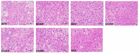 The liver tissues of the mice were stained with hematoxylin and eosin (HE) and the results are shown in Figure 11. In the HFD group, the liver cytoplasm displayed rounded lipid droplets and large vacuoles, along with a disorganized arrangement of hepatic cords. All the dietary fibre interventions improved the morphological damage to the liver caused by inflammation. In particular, this condition was significantly improved in the BLIDF group after the intervention, in accordance with the decrease in serum IL-6 levels.