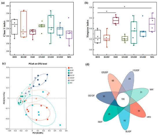 Dietary fibre can affect gut microbiota significantly; thus, the effects of soluble and insoluble dietary fibre ratios on gut microbiota were examined in our study. Firstly, the Chao1 index is an index utilized to estimate the total number of species within a community, whereas Simpson’s index is employed to assess species richness and the relative abundance of species within that community. As shown in Figure 12a,b, there was no significant difference between the groups in the Chao1 index, while the Simpson’s index significantly increased in the ISDF and MIX groups. It seems that ISDF and MIX may increase microbial diversity. PCoA analyses showed that all the dietary fibre intervention groups were distinctly separated from the HFD group, with only a partial overlap observed in the BLIDF group (Figure 12c). The results indicate that dietary fibre interventions can alter the composition of gut microbiota in obese mice, which is consistent with Peng’s results [5]. Specifically, the number of OTUs unique to the BLIDF and I2S2DF groups exceeded that observed in the HFD group, whereas the other intervention groups exhibited a lower abundance of specific OTUs (Figure 12d).