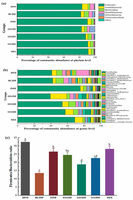 The gut microbiota composition of mice from different groups. (a) The gut microbiota composition at the phylum level. (b) The gut microbiota composition at the genus level. (c) The ratio of Firmicutes to Bacteroidota. Differences between each group corresponding to different letters are statistically significant (p < 0.05).