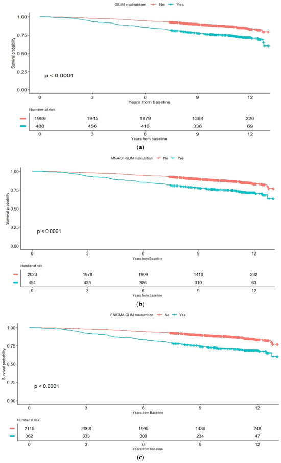 Kaplan–Meier curve survival analysis on (a) GLIM malnutrition, (b) MNA-SF-GLIM malnutrition, and (c) ENIGMA-GLIM malnutrition.