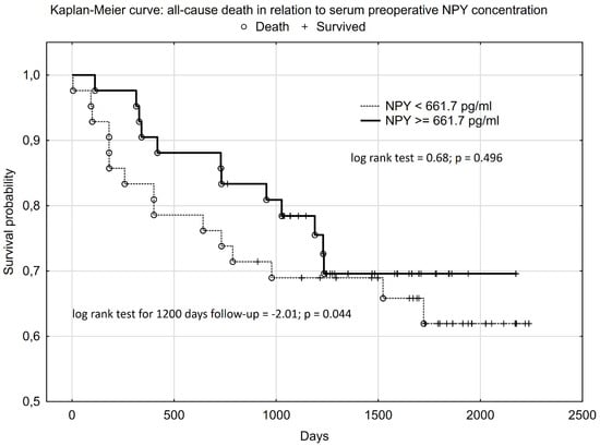 ROC analysis indicated that preoperative serum NPY concentration was predictive of having normal HGS before surgery, an SM CSA of ≥92 cm2 in CT slides at L3, and a sarcopenia diagnosis according to the BIA criteria (i.e., percentage of SM < 37% in males and < 31.5% in females). We also found that a low preoperative serum NPY concentration before CRC surgery was predictive of increased nutritional risk at the 3-month follow-up visit (Figure 1). However, we did not observe the NPY cut-off predicting all-cause death during follow-up in the ROC analysis. Therefore, in the Kaplan–Meier analysis, we used the median of the preoperative serum NPY concentration (661.7 pg/mL) to compare the patients’ survival during an average of 3.6 years of follow-up. It should be underlined that the median NPY value used was similar to the cut-off for preoperative NPY concentration obtained in the ROC analysis, which was predictive of increased nutritional risk (NRS_2002 ≥ 3) at the 3-month visit (Figure 1). A higher preoperative NPY serum concentration had a statistically significant influence on the patients’ survival up to 1200 days after CRC surgery (log-rank test = −2.01; p = 0.044) in the Kaplan–Meier analysis. However, when we performed the analysis for the entire follow-up (average of 3.6 years), the Kaplan–Meier curves overlapped, and the statistically significant difference disappeared (log-rank test = 0.68; p = 0.496) (Figure 2). However, the power of the survival analysis performed only amounted to 0.228 due to the small sample size and small number of outcomes measured. None of the CRC patients enrolled in this study required additional surgery, chemotherapy, or radiotherapy during the follow-up period beyond those presented in Table 2.