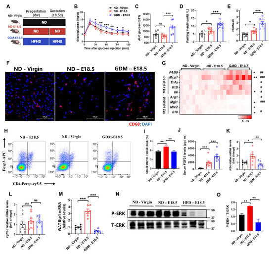Gestational diabetes mellitus exhibits aggravated adipose tissue inflammation and FGF21 signaling defects. (A) A schematic illustration of the experimental design. C57BL/6 female mice were fed a normal diet (ND) or a high-fat and high-sucrose (HFHS) diet for 8 weeks before mating and pregnancy (E0.5 to E18.5, 18 days). (B,C) Changes to blood glucose and the area under the curve (AUC) in the glucose tolerance test. (D,E) Fasting serum insulin levels and the HOMA-IR. (F) Representative images of WAT stained with an anti-CD68 antibody (red). (G) RT-qPCR analysis for mRNA expression levels of F4/80, M1, and M2 macrophages-related genes. (H,I) Flow cytometry analysis for the numbers of Trges in WAT. Trges were defined as CD4+FOXP3+. (J) Serum FGF21 levels. (K,L) RT-qPCR analysis for mRNA expression levels of Klb and Fgfr1c in WAT (n = 7–10 per group). (M–O) RT-qPCR analysis for mRNA expression levels of Egr1 (M) and Western blot analysis for Phosphorylated ERK1/2 (N, O) after tail vein injection of rmFGF21 (1 mg/kg). (n = 6 per group). Data are presented as means ± s.e.m. ND-Virgin vs. ND-E18.5, * p < 0.05, ** p < 0.01, *** p < 0.001. ns means no significant difference. ND—E18.5 vs. GDM—E18.5, # p < 0.05, ## p < 0.01, ### p < 0.001.