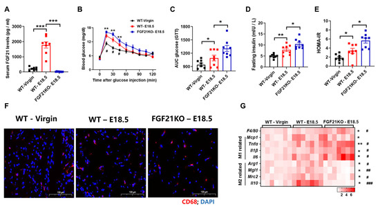 FGF21 is required for alleviating adipose tissue inflammation during pregnancy. (A) Serum FGF21 levels. (B,C) Changes to blood glucose and the area under the curve (AUC) in the glucose tolerance test. (D,E) Fasting serum insulin levels and the HOMA-IR. (F) Representative images of WAT stained with an anti-CD68 antibody (red). (G) RT-qPCR analysis for mRNA expression levels of F4/80, M1, and M2 macrophages-related genes. (n = 7–8 per group). Data are presented as means ± s.e.m. WT-Virgin vs. WT-E18.5, * p < 0.05, ** p < 0.01, *** p < 0.001. WT—E18.5 vs. FGF21KO—E18.5, # p < 0.05, ## p < 0.01, ### p < 0.001.