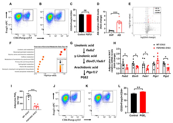 FGF21 promotes Tregs differentiation through linolenic acid-mediated PGE2 synthesis in adipocytes. (A–C) Primary CD4+ T cells were purified from spleen for these studies. The number of Tregs after FGF21 treatment (100 μM). (D) RT-qPCR analysis for mRNA expression levels of Klb in stromal vascular fraction (SVF) and mature adipocyte (AD) fraction isolated from WAT at E18.5 of pregnancy. (E) A volcano plot showing significantly changed metabolites in the mature adipocyte between WT and FGF21KO mice at E18.5 of pregnancy. (F) Metabolic pathways showing significant changes in linolenic acid metabolism. (G,H) The linolenic acid metabolic pathway to synthesis of PGE2 and the rate-limiting enzyme mRNA expression levels in mature adipocyte. (I) The PGE2 levels in WAT at E18.5 of pregnancy as determined by ELISA. (J–L) The number of Tregs after PGE2 treatment (100 nM). Data are presented as means ± s.e.m. * p < 0.05, ** p < 0.01, *** p < 0.001. ns means no significant difference.
