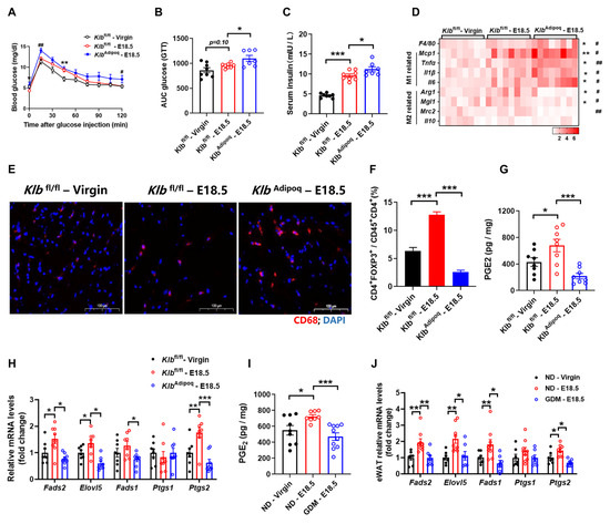 Deficiency of FGF21 signaling in adipocytes increases adipose tissues inflammation during pregnancy. (A,B) Glucose tolerance test, and area under curve. (C) Serum insulin levels measured by ELISA. (D) RT-qPCR analysis for mRNA expression levels of F4/80, M1 and M2 macrophages related genes. (E) Representative images of WAT stained with anti-CD68 antibody (red). (F) Flow cytometry analysis for numbers of Trges in WAT. Trges were defined as CD4+FOXP3+. PGE2 levels and synthesis rate-limiting enzyme mRNA expression levels in WAT at E18.5 of pregnancy from KlbAdipoq (G,H) and GDM mice (I,J). Data are presented as means ± s.e.m. Klbfl/fl-Virgin vs. Klbfl/fl—E18.5, * p < 0.05, ** p < 0.01, *** p < 0.001. Klbfl/fl—E18.5 vs. KlbAdipoq—E18.5, # p < 0.05, ## p < 0.01.