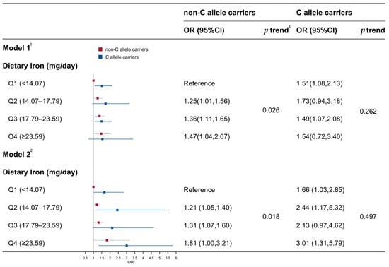 The association between dietary iron and risk of elevated fasting glucose stratified by C allele presence of the SNP rs864745 among the male participants. 1 Model 1 was adjusted for age. 2 Model 2 was adjusted for age, income, BMI, education, intentional physical exercise, smoking status, alcohol use, and total dietary energy. 3 The p-value for the trend was examined using the medians in each quartile of dietary iron.