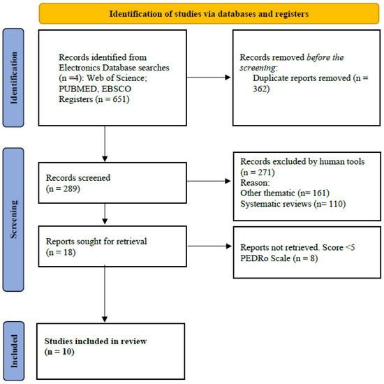 A total of 651 articles were identified, of which 55% (n = 362) were duplicated in the different databases. In this phase, 289 articles were selected by reading the title and abstract. Moreover, 93% (n = 271) were excluded because they were systematic reviews or did not include results that would allow for an analysis of the efficacy of CHO, gluten-free, and low-FODMAP diets in preventing GISs in adult EAs of both sexes. The remaining 18 articles were evaluated using the PEDro Scale [38]. Of these, eight articles were excluded because they did not score ≥6 on the PEDro Scale. The PRISMA flow diagram (Figure 1) shows the steps of the search strategy and the 10 articles considered for this systematic review.
