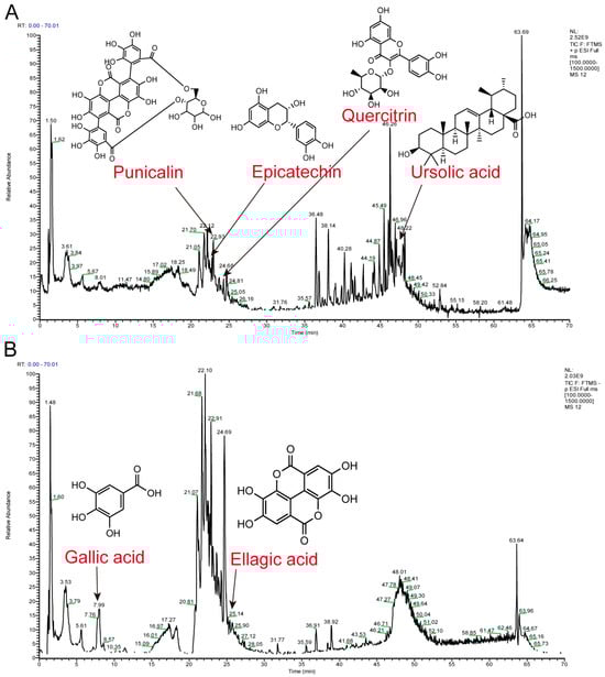 We characterized the main components of PPE extract by UPLC-Q-Exactive Orbitrap MS/MS (Figure 1 and Table S1), which identified a total of 189 components (Table S3). These included 35 flavonoids, 17 organic acids, 12 amino acids, 11 fatty acids, 11 terpenoids, 10 phenols, 8 lignans, 7 glycosides, 7 amides, 6 esters, 4 nucleosides, 4 vitamins, 3 alkaloids, 3 hormones, 3 amino alcohols, 3 aromatic aldehydes, and 43 others. According to the report, the compounds that may play a key therapeutic role among these included ellagic acid, gallic acid, quercitrin, punicalin, ursolic acid, and epicatechin, with detailed information provided in Table 2. These results highlight the complexity and diversity of compounds present in PPE, which may contribute to its therapeutic properties.