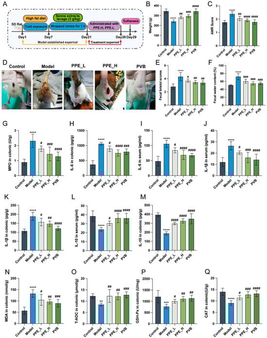 Protective effect of PPE on IBS-D rats (n = 6). (A) Overview of the experimental procedure involving PPE treatment for IBS-D. (B) Changes in body weight across groups following administration of PPE. (C) AWR scores for each experimental group. (D) Diarrheal symptoms observed in rats across groups at the conclusion of PPE treatment. (E) Bristol stool scores for fecal samples from each group. (F) Fecal water content across the groups. (G) Levels of MPO in colonic tissues. (H–M) Levels of IL-6, IL-1β and IL-10 in colon tissue and serum. (N–Q) Detection of MDA, T-AOC, GSH-Px, and CAT levels in colon. ** p < 0.01, *** p < 0.001, **** p < 0.0001 compared to the control group, # p < 0.05, ## p < 0.01, ### p < 0.001, #### p < 0.0001 compared to the model group.