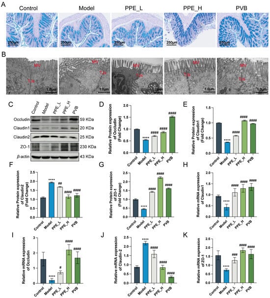 To assess the impact of PPE on the intestinal barrier in IBS-D rats, we employed AB-PAS staining and transmission electron microscopy (TEM) to investigate the structural integrity of colon tissues. Our results revealed that PPE administration significantly increased the population of goblet cells and conferred protection to microvilli from damage compared to the model group (Figure 3A,B). Furthermore, we evaluated the expression levels of tight junction proteins, especially Occludin, Claudin1, Claudin2, and ZO-1. Our analysis indicated that PPE treatment notably elevated the expression of Occludin, Claudin1, and ZO-1, while concurrently decreasing the expression of Claudin2 (Figure 3C–G). These observations were further corroborated at the mRNA level (Figure 3H–K). Collectively, these findings suggested that PPE plays a significant role in preserving the integrity of the intestinal barrier.