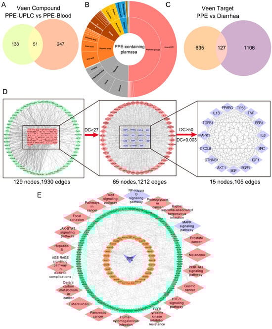 Network pharmacology combined with serum pharmacochemistry for mechanistic analysis of PPE on IBS-D. (A) Intersection of mass spectrometry components of PPE with components identified in serum. (B) Classification of prototype components that enter the bloodstream. (C) Overlap between the targets of mass spectrometry components and blood-entry components. (D) Identification of core targets within the protein–protein interaction (PPI) network. (E) KEGG enrichment to analyze potential signaling pathways.