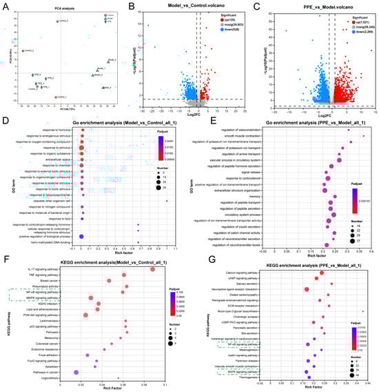 Transcriptomic analysis of PPE on diarrhea in IBS-D. (A) Results of principal component analysis (PCA). (B) Volcano plot comparing Model and Control groups. (C) Volcano plot comparing PPE and Model groups. (D) GO enrichment analysis between Model and Control groups. (E) GO enrichment analysis between PPE and Model groups. (F) KEGG enrichment analysis comparing Model and Control groups. (G) KEGG enrichment analysis of PPE compared to the Model group.