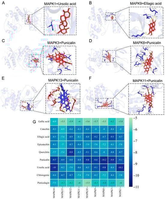 Molecular docking of major components in PPE with key targets in the MAPK signaling pathway. (A) Molecular docking of MAPK1 with Ursolic acid. (B) Molecular docking of MAPK9 with Ellagic acid. (C) Molecular docking of MAPK3 with Punicalin. (D) Molecular docking of MAPK8 with Punicalin. (E) Molecular docking of MAPK13 with Punicalin. (F) Molecular docking of MAPK11 with Punicalin. (G) Post-docking binding energy thermograms for nine components of PPE with nine major proteins in the MAPK signaling pathway.