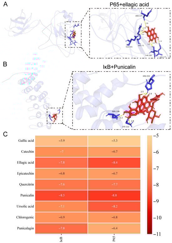 Molecular docking of major components in PPE with key targets in the NF-κB signaling pathway. (A) Molecular docking of P65 with Ellagicacid. (B) Molecular docking of IκB with Punicalin. (C) Binding energy thermograms for nine components of PPE following docking with P65 and IκB proteins.
