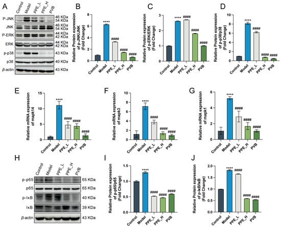PPE inhibits MAPK and NF-κB signaling pathways in IBS-D rats. (A) Expression levels of major proteins in the MAPK signaling pathway in IBS-D after PPE administration. (B–D) Quantitative analysis of the expression levels of p-JNK, p-ERK, p-P38 in the MAPK signaling pathway following PPE administration. n = 3. (E–G) The mRNA levels of mapk14, mapk3, mapk1. n = 6. (H) Expression levels of major proteins in the NF-κB signaling pathway in IBS-D after PPE administration. (I,J) Quantitative analysis of expression levels of p-P65, p-IκB in the NF-κB signaling pathway in IBS-D after PPE. n = 3. **** p < 0.0001 compared to the control group, #### p < 0.0001 compared to the model group.
