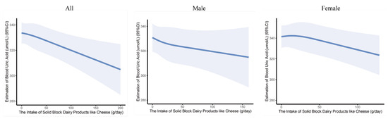 The dose–response curves of the intake of solid block dairy products like cheese and serum uric acid levels in children and adolescents. The associations were adjusted for age, gender, BMI, residence, physical activity time, energy intake, exposure to secondhand smoke, and alcohol consumption.