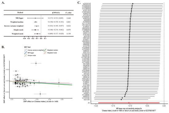 Two-sample Mendelian randomization analysis of cheese intake and serum uric acid levels. (A) Mendelian Randomization; CI, confidence interval. (B) A scatter plot is used to visually represent the causal relationship between cheese intake and serum uric acid levels. (C) A forest plot depicting the ‘leave-one-out’ sensitivity analysis method to illustrate the impact of individual SNPs on the outcomes.