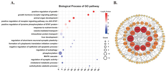 Bioinformatics analysis of genes mapped by functional SNPs. (A) Biological process of GO pathway. (B) PPI network.