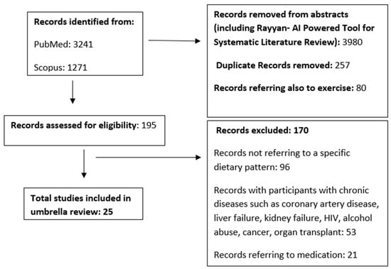 Articles should be meta-analyses of RCTs, written in English, and refer to a certain dietary pattern (such as Mediterranean diet, LCD, or low-fat diet), but not to an individual food group. The population studied male and female adults (>18 years old) with one or more CV risk factors (such as dyslipidemia, high blood pressure, MetS, T2D, obesity) but not established CVD. Any article assessing medication, studies referring to animals or participants with chronic diseases such as liver failure, chronic kidney disease, human immunodeficiency virus (HIV), alcohol abuse, cancer, or organ transplants were excluded.