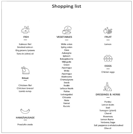 The menu plans of each phase are designed for patients to always have a sufficient food intake to cover their daily protein needs. In assistance, patients were provided with a brochure containing a weekly “shopping list” (Figure 1) as well as a menu plan to provide detailed information and constitute a suitable template for all patients during the dietary intervention. The RLCKP protocol was set to endure 4 weeks and intends to completely eradicate the intake of sugars and carbohydrates in the metabolic system. The aim thereof is the achievement of a ketosis metabolic state at which the human metabolism switches its energy supply from intake of sugars and carbohydrates to self-metabolization of fatty acids in the liver to provide a source of energy in the form of ketone bodies. The macronutrients are calculated individually for every patient and visualized (Figure 3). The eating period is restricted to a maximum of 12 h per day. Each participant was followed for four weeks, and a daily notice was taken of the compliance/adherence to the diet.