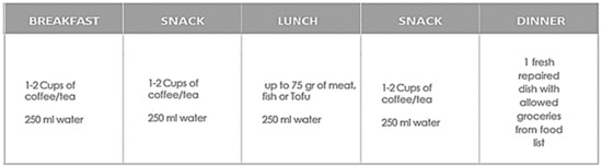 As provided by the menu plan (Figure 2), 1–2 cups of coffee or tea are intended for breakfast and afternoon snack time.