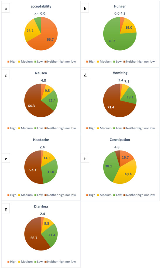 We conducted an evaluation of the median values related to dietary acceptability and the occurrence of hunger, nausea, headaches, and bowel function by utilizing self-reported questionnaires administered from week 1 to week 4 of the diet. The majority of the participants demonstrated a high level of acceptability (see Figure 4a). Hunger was reported frequently by 4.8% of the patients (refer to Figure 4b), while instances of nausea (Figure 4c) and vomiting (Figure 4d) were infrequently noted during the diet period. Headaches, likely attributed to the presence of ketones, were reported frequently by 16% of participants (see Figure 4e). Lastly, medium constipation was the most reported gastrointestinal issues (refer to Figure 4f,g).