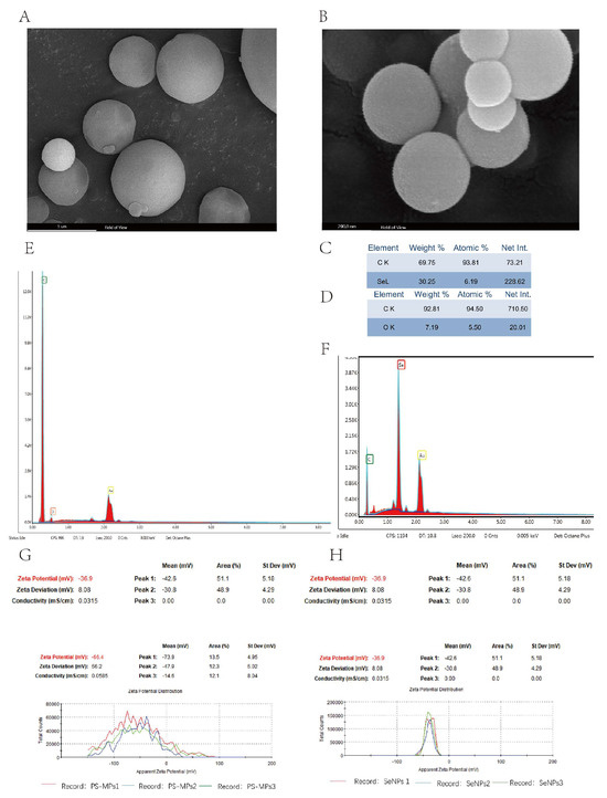 Characterization results of PS-MPs and SeNPs. (A) Scanning electron microscopy of PS-MPs. Scale bar, 5 μm. (B) Scanning electron microscopy of SeNPs. Scale bar, 200 nm. (C,E) EDS of PS-MPs. (D,F) EDS of SeNPs. (G) ζ-potential map of PS-MPs. (H) ζ-potential diagram of SeNPs.
