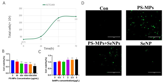 Growth curves were established for normal mouse NCTC1469 hepatocytes. Cells were counted from the start of recovery and the total number of cells was then measured at 24 h, 48 h, and 72 h. Cells from 0–24 h were in the lag phase, 24–48 h cells were in the stationary phase, and 48–72 h cells were in the equilibrium phase. Therefore, NCTC1469 cells were cultured for 48 h before exposure to PS-MPs and SeNPs was performed (Figure 2A).