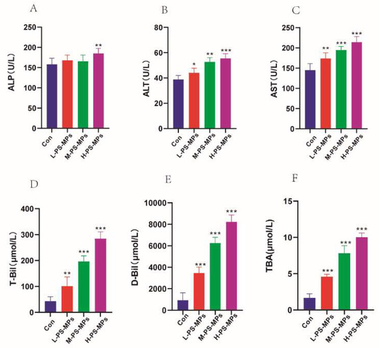 Effects of PS-MPs on biochemical indices in mice (n = 6). (A) Serum alkaline phosphatase (ALP), (B) serum alanine aminotransferase (ALT), (C) serum aspartate transaminase (AST), (D) total bilirubin (T-Bil), (E) direct bilirubin (D-Bil), (F) total bile acid (TBA). *: p < 0.05, **: p < 0.01, ***: p < 0.001.