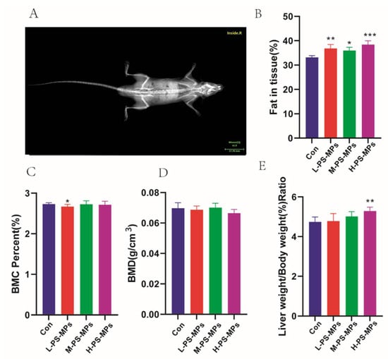 After being exposed for 28 days, the mice were euthanized and subjected to testing using a bone densitometer (Figure 4A). A notable variation in bone mineral content (BMC) was observed in the low-dose PS-MP group compared to the control group (p < 0.05), while the remaining groups did not show any significant difference (Figure 4C). On the other hand, there was no notable variation in BMD among the groups, which did not show any statistical significance (Figure 4D). Nonetheless, there existed a notable disparity in the lipid composition within the mouse tissues among all PS-MP groups and the control group, particularly in the high-dose PS-MP group (10 mg/kg/d) in comparison to the control group (p < 0.001) (Figure 4B). In addition, the liver ratios of mice in the high-dose PS-MP group (10 mg/kg/day) showed significant differences (p < 0.01) relative to the control group (Figure 4E). Hence, the high-dose category of PS-MPs (10 mg/kg/d) was employed as the ideal dosage of PS-MPs in Animal Experiment II for subsequent examinations.