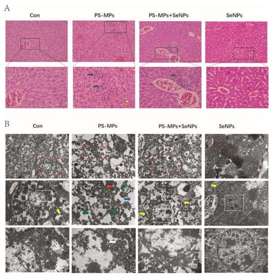 TEM was used to observe the cellular ultrastructure in liver tissue 28 days after molding, as shown in Figure 5B. After being exposed to PS-MPs, hepatocytes displayed distorted nuclei (indicated by green arrows), blurred cell membrane boundaries (indicated by red arrows), and cytoplasm filled with vacuoles (indicated by blue arrows) when observed at a magnification of 5000×. At 15,000× magnification, PS-MP exposure showed a slightly abnormal mitochondrial structure with loosely arranged cristae (white arrows). The histopathological findings in the PS-MP + SeNP group, on the other hand, were significantly improved, with no deformation of the nucleus and clear cell membrane boundaries. Cell membrane boundaries were clearer in the control, SeNP and PS-MP + SeNP groups (yellow arrows). The SeNP group did not show any notable distinction when compared to the control group. The findings from all these experiments clearly demonstrated that SeNPs exert a notable counteractive impact on liver damage caused by PS-MPs.