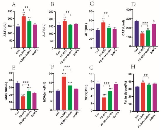 SeNPs attenuate PS-MP-induced liver function impairment. (A) Serum aspartate transaminase (AST) (B) serum alkaline phosphatase (ALP), (C) serum alanine aminotransferase (ALT), (D) catalase (CAT), (E) glutathione (GSH) (F) malondialdehyde (MDA), (G) superoxide dismutase (SOD), (H) fat content in tissues. The data are presented as the average plus or minus the standard deviation (n = 6). *: p < 0.05, **: p < 0.01, ***: p < 0.001. p-values of groups compared with each other: ##: p < 0.01, ###: p < 0.001.