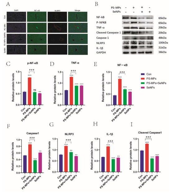 Effects of SeNPs on PS-MP-induced liver-injury-related proteins by modulating the NF-κB/NLRP3 inflammatory vesicle pathway. (A) Immunofluorescence expression of NF-κB protein and NLRP3 protein in the liver of each group of mice. (B) Protein blots of NF-κB, P-NF-κB, TNF-α, Cleaved Caspase1, Caspase1, NLRP3, IL-1β (n = 3). (C–I) Quantitative expression of these proteins (n = 3). **: p < 0.01, ***: p < 0.001, ns: not statistically significant. p-values of groups compared with each other: ###: p < 0.001.