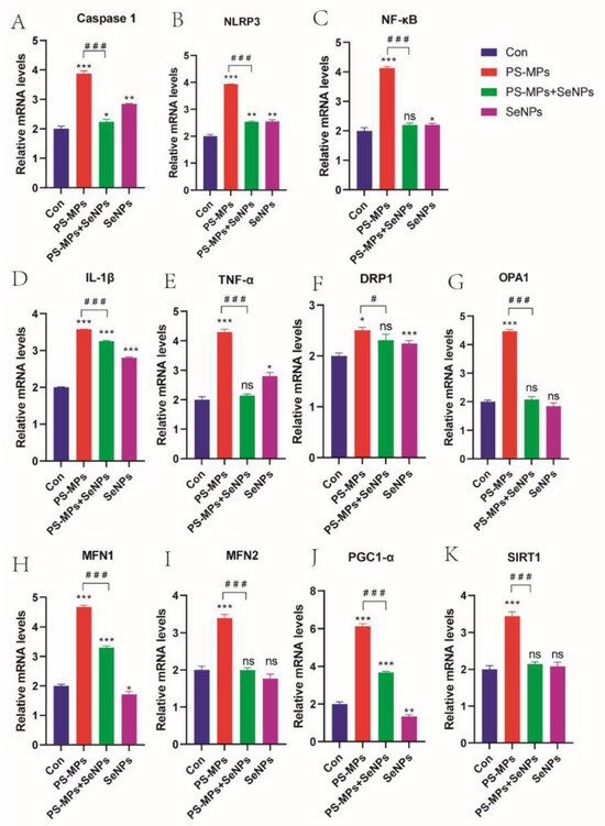 Measurement using quantitative real-time fluorescence qPCR. (A–E) Levels of gene expression related to inflammation. (F–K) Levels of gene expression linked to mitochondria. *: p < 0.05, **: p < 0.01, ***: p < 0.001, ns: not statistically significant. p-values of groups compared with each other: #: p < 0.05, ###: p < 0.001. ns: not statistically significant.