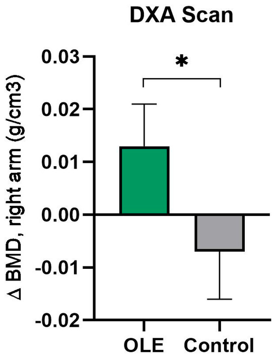 The change in BMD in the right arm following OLE or control supplementation. Data are presented as mean change from baseline ± SEM. Analyses were performed with a linear mixed model using time and treatment as a fixed factor and participant as a random factor. * indicates p ≤ 0.05. Abbreviations: BMD: bone mineral density; DXA: Dual-energy X-ray absorptiometry; OLE: olive leaf extract.