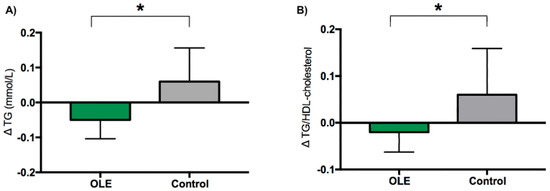 The change in serum triglycerides (A) and the triglyceride/HDL cholesterol ratio (B) following OLE or control supplementation. Data are presented as mean change from baseline ± SEM. Analyses were performed with a linear mixed model using time and treatment as a fixed factor and participant as a random factor. * indicates p ≤ 0.05. Abbreviations: OLE: olive leaf extract; TG: triglycerides.